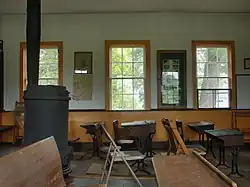 The Wylie School is located in a rural setting, at the northern corner of Ekonk Hill Road (Connecticut Route 49) and Sandhill Road. It is a small single-story wood-frame structure with a gable roof and clapboarded exterior. Its main facade has two matching entrances, framed by simple molding and topped by a cornice. The interior has two vestibules with closets between them, leading into a single large schoolroom with a raised section at the back. The building's utilitarian appearance, which is largely devoid of period stylistic embellishments, was probably more typical of Connecticut's 19th-century district schools. The interior has been furnished to give the appearance it might have had in the 19th century, although the fixtures are not original. The property includes a period privy.[2]