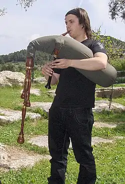 The xeremia (Catalan pronunciation: [ʃəɾəˈmi.ə], plural xeremies) is a type of bagpipe native to the island of Majorca (Mallorca).[1] It consists of a bag made of skin (or modern synthetic materials), known as a sac or sarró which retains the air, a blowpipe (bufador), a melody pipe or chanter (grall), and several, generally three, drones (bordons). The primary drone (roncó) sounds a tonic note, but the other drones are sometimes simply false drones for ornamentation.[2]