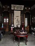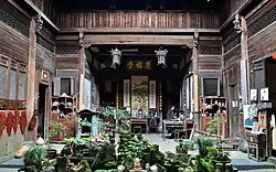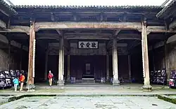 Xidi has maintained its original street plan and water systems from the medieval period. The street pattern of Xidi is dominated by a main road which runs in an east–west direction and is flanked by two parallel streets. These major streets are joined by many narrow alleyways. These streets are paved with original Yi County granite. Small open spaces are confined to areas immediately in front of the main public buildings, such as the "Hall of Respect", the "Hall of Reminiscence", and the "Memorial Archway of the Governor".[6] As was typical for the time, the buildings are clustered near the three streams that make up the city. In the city, there are 224 ancient residential buildings, dating from between the 14th and 19th centuries. Of those, there are 124 well-preserved wooden residences from the Ming and Qing dynasties with beautiful carvings form the major attractions. The residences usually contain a central courtyard surrounded by symmetrical bays of rooms. Many of these residences are open to the public.[6]
