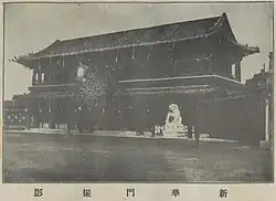 During the reconstruction project, a section of the imperial city wall on the south side of Baoyue Tower was demolished, and two new eight-shaped walls were built on the east and west sides to connect the imperial city wall and Baoyue Tower.[3] A large screen wall was also built on the north side of the building, near the Taiye Lake, to block the view of outsiders. The plaque "Xinhua Gate" was written by Yuan Lizhun. The plaque is 0.64 meters high and 1.6 meters wide, and the font is in the official script.[5] This plaque is still hanging on the door today. A pair of stone lions are placed in front of the door, which are said to be relics of the original Prince Duan's Mansion. It is said that this was the largest pair of stone lions in the old city of Beijing.[3]