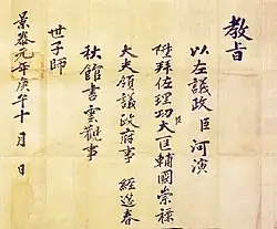 In 1466, the position was officially put in statutory form with the finalization of the Kyŏngguk taejŏn.[6][7] The Yeongjuijeong title was generally conferred on a senior minister who had previously served as Chwaŭijŏng (Left State Councilor),[8] a post immediately below that of Yŏngŭijŏng, but higher than that of Uŭijŏng (Right State Councillor).[9] The three councilors were collectively known as the "Chŏngsŭng" (정승; 政丞),[10] or "Samŭijŏng" (삼의정; 三議政; lit. Three High Councillors).[3]