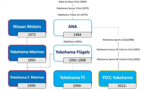 Y.S.C.C. Yokohama was the starting point for many Yokohama Flügels and Yokohama F. Marinos players. When the Flügels folded in 1999, they supported the creation of Yokohama FC to replace them.