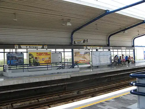 The Y Griega Station (Spanish: Estación Y Griega) is a station on Line 1 of the Monterrey Metro,[1][2] a light rail system in Monterrey, Mexico.[1] The station was opened on 25 April 1991 as part of the inaugural section of Line 1, going from San Bernabé to Exposición.[3][1][2]