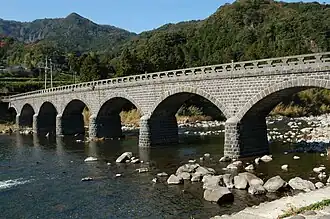 Yabakei Bridge (耶馬渓橋, Yabakei-bashi) is a Taishō-era stone bridge over the Yamakuni River in Yabakei, Nakatsu, Ōita Prefecture, Japan. Construction work on the eight-arched bridge, built as part of a tourist road for the viewing of the nearby Aonodōmon, began in 1920 and was completed in 1923; repair and restoration work took place in 1999. At 115.7 metres (380 ft) in length, it is the longest stone bridge in the country, and has been designated an Important Cultural Property.[1][2][3][4]