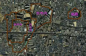 Yamashina Hongan-ji layout superimposed on a modern aerial photograph