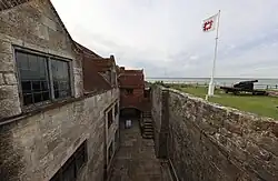 The accommodation and other facilities are on the south side of the castle.[49] On the ground floor, the entrance to the castle leads through to a courtyard, linked to four barrel-vaulted rooms in the south-west corner, originally 17th-century lodgings for the garrison.[50] Two of these chambers were converted for use as magazines and the fittings of one of these still remains in place.[50] In the south-east corner is the Master Gunner's House, comprising a parlour, hall and kitchen on the ground floor, and a chamber and attic on the floors above.[51] The parlour and hall would have originally been separated by a screen; the chamber would also have been subdivided.[52] On the first floor is a small chamber, supported on arches above the courtyard, which was used as a lodging.[53] On the second floor, the Long Room runs on top of the barrel-vaulted chambers, its massive, original roof still intact.[54]