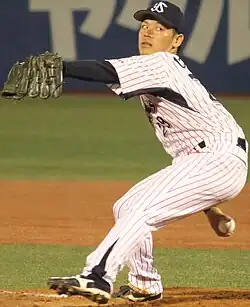 His unusual pitching form, most notably his leg kick, earned him the nickname "Ryan" for it was fashioned after the style MLB Hall of Famer Nolan Ryan.[21] Listed at 171 cm (5 ft 7 in), he may lack the advantage of having longer limbs for extra power, but his form has a slower rhythm to it, making his pitches more difficult to time.[4][22] With an overhand delivery, he throws a four-seam fastball typically at high-80s mph (tops out at 150 km/h or 93 mph).[23] He can throw decent two-seamers and cutters, sliders, and forkballs.[24]