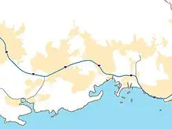 "Interstate" Highway PRI-2 goes through Yauco. Urbanized areas are shaded in peach