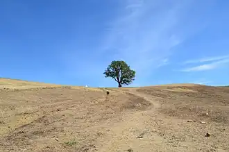 The climate is semi-desert and the hills are mostly covered with grasses and shrubs, including feather grass, Volga fescue, wormwood and saltwort, but some trees, such as willow, oak, elm, and aspen, may grow in the ravines of the eastern slopes.[2]