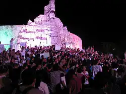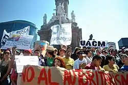 Yo Soy 132, commonly stylized as #YoSoy132, was a protest movement composed of Mexican university students from both private and public universities, residents of Mexico, claiming supporters from about 50 cities around the world.[2] It began as opposition to the Institutional Revolutionary Party (PRI) candidate Enrique Peña Nieto and the Mexican media's allegedly biased coverage of the 2012 general election.[3] The name Yo Soy 132, Spanish for "I Am 132", originated in an expression of solidarity with the original 131 protest's initiators. The phrase drew inspiration from the Occupy movement and the Spanish 15-M movement.[4][5][6] The protest movement was known worldwide as the "Mexican spring"[7][8] (an allusion to the Arab Spring) after claims made by its first spokespersons,[9] and called the "Mexican occupy movement" in the international press.[10]