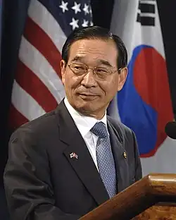 Yoon Kwang-ung (born October 13, 1942, in Busan) is a retired Vice Admiral of the Republic of Korea Navy & former South Korean Minister of National Defense.[1] He held the 39th to hold the post, which he entered in July 2004 after being appointed by president Roh Moo-hyun. He graduated from Busan Commercial High School in 1961 and from the ROK Naval Academy in 1966.[2] He served in various positions in the Navy from 1985 to 2000; thereafter, he worked for three years as an advisor to Hyundai Heavy Industries.