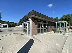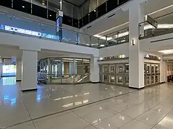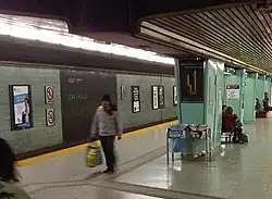 By 2015,[2] the tiles on the walls, floors and stairs had been replaced at this station.[3] On the outer walls at track level the alternating light and dark green tiles were replaced by very light green metal panels with a dark green accent strip along the top. Moreover, in 2015 the station's 263 space commuter parking lot was sold to developers.[4][5]