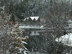 It continues east into Baptiste Lake where it enters geographic Herschel Township[3] in the municipality of Hastings Highlands, Hastings County. The river leaves the lake south at the lake's southeast tip, controlled by the Ontario Ministry of Natural Resources-operated Baptiste Lake Dam,[4] enters the town of Bancroft, and passes over the Bancroft Light & Power Generating Station and dam. The river is crossed by Ontario Highway 28 and Ontario Highway 62 in the town centre, then turns east and northeast. It is crossed again by Ontario Highway 28, passes over Egan Chute and Fram Chute at Egan Chutes Provincial Park,[5] and briefly reenters Hastings Highlands at geographic Monteagle Township.[6]