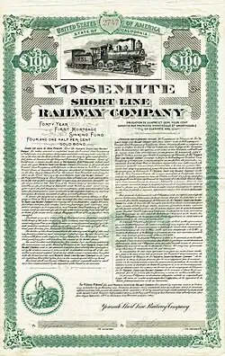 The Yosemite Short Line Railway was a 2 ft 6 in (762 mm) narrow gauge railway constructed in the Yosemite region of California. The plan was to construct a railway 60 miles (97 km) long, serving logging interests and tourists visiting the Yosemite National Park. Construction commenced in 1905 but construction was abandoned due to the financial crisis caused by the 1906 San Francisco earthquake, with only 8.5 miles (13.7 km) constructed. The railway was abandoned by 1917. Locomotive power was provided by two Porter 0-4-0T steam locomotives.[1]