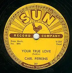"Your True Love" is a 1957 song written by Carl Perkins and released as a single on Sun Records. The single was released as a 45 and 78 backed with "Matchbox" in February, 1957.[1] The recording, Sun 261, reached no. 13 on the Billboard country and western chart and no. 67 on the Billboard pop singles chart that year. The song was recorded on Tuesday, December 4, 1956 when Elvis Presley made a surprise visit to Sun Studios at 706 Union in Memphis, Tennessee. Johnny Cash and Jerry Lee Lewis also participated in the impromptu jam session that day known as the Million Dollar Quartet.[2] Jerry Lee Lewis also played piano on the recording.