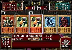 Each duelist includes a "Deck Leader" who is also placed on the battlefield.[4] It represents the duelists and can move around the battlefield while being vulnerable to attacks from the opponent.[3] Each deck leader has a total of forty cards per duel; each deck has a "deck cost", which is a card's strength-based value. For each battle, the deck must be less than a specific deck cost that is significant to the opponent.[4] Each deck leader can play one card per turn and is placed adjacent to them. When two monster cards collide on the field, they are flipped face up, and a battle is commenced similar to the trading card game, with life points deducted accordingly.[3] Spell and trap cards can also be placed throughout the field and activated under a variety of conditions.[4]