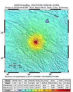 1. ^ a b c "Magnitude 6.9 – SOUTHERN QINGHAI, CHINA 2010". United States Geological Survey. April 14, 2010. Archived from the original on 15 April 2010. Retrieved 14 April 2010.