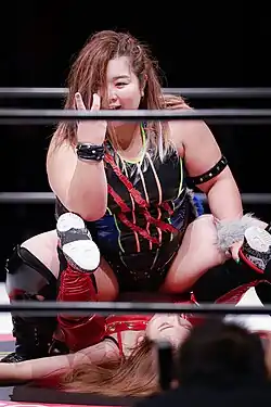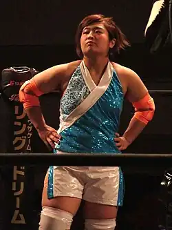 She also competed in the DDT Peter Pan branch of events. At Ryōgoku Peter Pan 2016 on August 28, she teamed up with Hyper Misao and Shoko Nakajima in a losing effort to Akane Miura, Miyu Yamashita and Yuka Sakazaki.[15] At Ryōgoku Peter Pan 2017 on August 20, she won a Rumble rules match for the Ironman Heavymetalweight Championship also involving Mizuki, her trainer Cherry, Yuna Manase, Maho Kurone and others.[16]