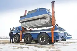 These vehicles are notable for being Screw-propelled vehicles (in Russian: шнекохо́д), allowing it to traverse inhospitable terrains. The vehicle was designed to recover re-entered Soyuz space capsules from difficult terrain. It was equipped with heaters for the front seats, transponder and radio and stretchers.[3]