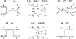 Feynman diagrams for important contributions to ZZ production. Diagrams can be distinguished as those involving the H boson (top) and those that give rise to continuum-ZZ production (bottom), which interact destructively with each other. [1]