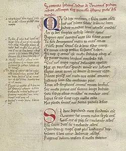Zambono wrote a short poem on the families of Padua, their castles and coats of arms. It is known today only from quotations in the De generatione aliquorum civium urbis Padue of Giovanni da Nono.[5] He also contributed two poems to a poetic debate between Lovato Lovati and Albertino Mussato over whether it was better to have children or not. After five poems each, Zambono judged the debate in favour of Lovato and childlessness. After Mussato appealed the decision to Benvenuto Campesani, Zambono wrote a poem addressed to Campesani defending his judgement.[6] The collection of twelve poems is often known collectively as De prole.[1] Imitating the troubadours, all three participants took nicknames (senhals). Zambono went by Bos (ox), while Lovato was Lupus (wolf) and Mussato Asellus (ass).[7] In his judgement, Zambono speaks from experience: