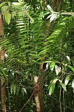 The stem of Zamia fairchildiana is erect (tree-like), 0.5 to 1 metre (1 ft 8 in to 3 ft 3 in) tall, and 6 to 15 centimetres (2.4 to 5.9 in) in diameter. It has three to ten compound-leaves on the apex of the stem. Leaves are 0.7 to 2 metres (2 ft 4 in to 6 ft 7 in) (exceptionally 2.5 metres (8 ft 2 in)) long. Petioles (leaf stalks) are 0.3 to 0.5 metres (1 ft 0 in to 1 ft 8 in) (exceptionally 0.8 metres (2 ft 7 in)) long and densely covered with prickles. The lower third of the rachis (leaf mid-rib) also has prickles. There are 10 to 30 pairs of leaflets on a leaf. The leaflets are oblong, somewhat sickle shaped, with acute points, and have a few fine teeth near the tip of the leaflet.[7]