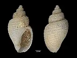 The length of the shell attains 8.8 mm, its diameter 4.75 mm.[2] The shell is very light coloured cream-white and coils 4 times to a point at the opposite end of the opening of the shell. Each coil is smaller than the last.