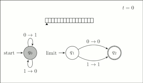 A more formal model of the Zeno machine is the infinite time Turing machine. Defined first in unpublished work by Jeffrey Kidder and expanded upon by Joel Hamkins and Andy Lewis, in Infinite Time Turing Machines,[2] the infinite time Turing machine is an extension of the classical Turing machine model, to include transfinite time; that is time beyond all finite time.[2] A classical Turing machine has a status at step (in the start state, with an empty tape, read head at cell 0) and a procedure for getting from one status to the successive status. In this way the status of a Turing machine is defined for all steps corresponding to a natural number. An ITTM maintains these properties, but also defines the status of the machine at limit ordinals, that is ordinals that are neither nor the successor of any ordinal. The status of a Turing machine consists of 3 parts: