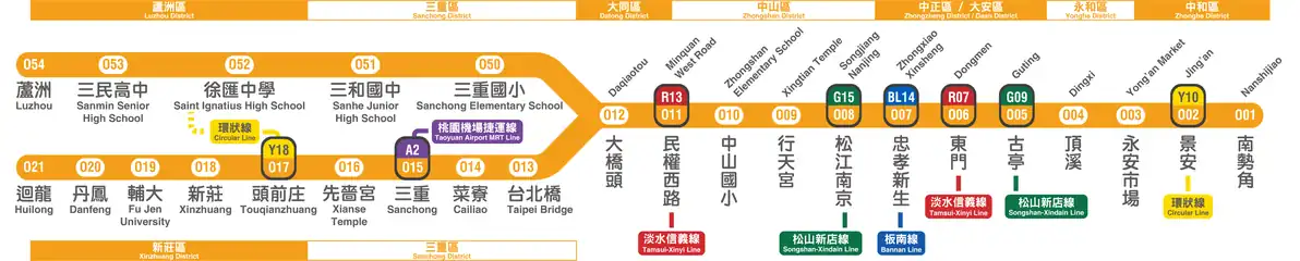 The Zhonghe–Xinlu or Orange line (code O) is a metro line in Taipei operated by the Taipei Metro, named after the districts it connects: Zhonghe, Xinzhuang and Luzhou. The line starts at Nanshijiao in Zhonghe, passes through central Taipei, then splits into two branches: one to Huilong via Xinzhuang and one to Luzhou.