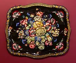 Zhostovo painting (Russian: Жостовская роспись) is a Russian folk handicraft. It involves painting metal trays. It is practiced in the village of Zhostovo in the Moscow Oblast.[1] It appeared in the early 19th century, mainly under the influence of the Ural handicraft of flower painting on metal. Subsequent development of Zhostovo painting handicraft was stylistically related to porcelain and enamel painting techniques, used by factories near Moscow, flower motifs on printed cotton, produced by the Ivanovo factories, and Lukutin miniatures (see Fedoskino miniatures).