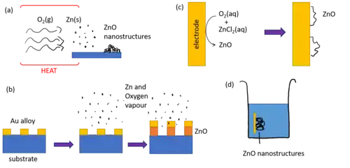 Another method to synthesise ZnO nanostructures is electrodeposition, which uses electric current to facilitate chemical reactions and deposition on electrodes. Its low temperature and ability to create precise thickness structures makes it a cost-effective and environmentally friendly method.[9] Structured nanocolumnar crystals, porous films, thin films and aligned wires have been synthesised in this way. The quality and size of these structures depends on substrates, current density, deposition time and temperature.[10][11][9] The bandgap energy is also dependent on these parameters, since it is dependent not only on the material but also its size due to the nanoscale effect on the band structure.[1]