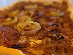 Zwiebelkuchen (German pronunciation: [ˈt͜sviːbl̩ˌkuːxn̩], lit.'onion cake') is a savory German onion cake made of steamed onions, diced bacon, cream, and caraway seeds on either a yeast or leavened dough.[1] It is not to be confused with Flammkuchen, a similar dish that is drier.
